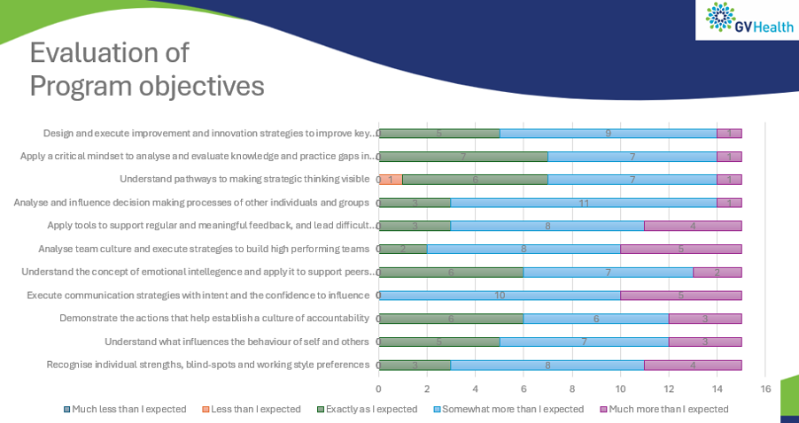 The Emerging Leaders Program successfully developed leaders who are capable of managing teams effectively and driving strategic growth and innovation at GV Health. This was achieved through the following: